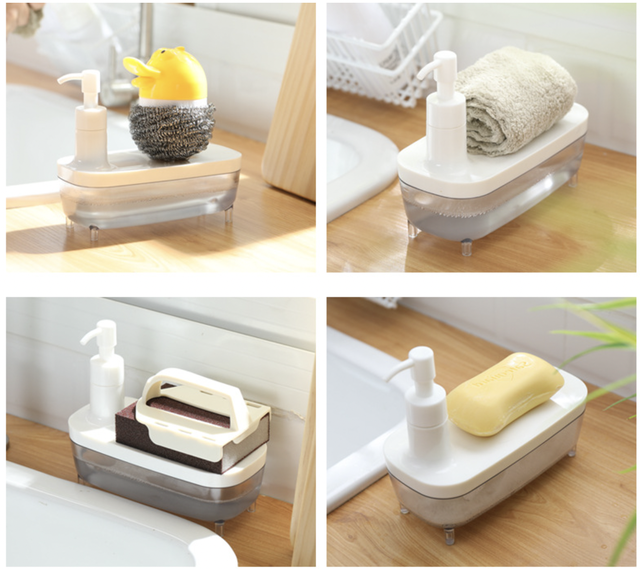 Перша ємність – це дозатор для рідкого мила, а друга призначена для зберігання щіток, ганчірочок, губок або інших предметів. Все залежить від фантазії та необхідності. Аксесуар незамінний для правильної організації простору, тому він буде ідеальним подарунком.