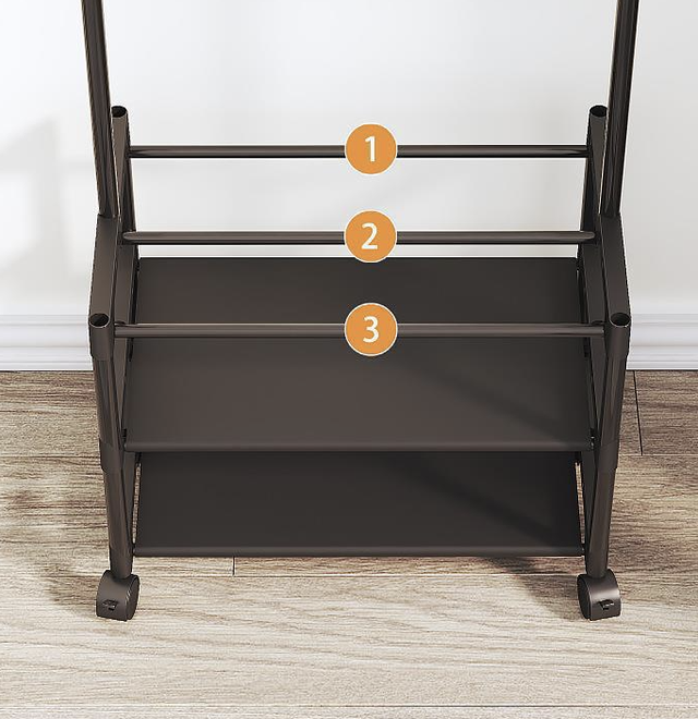 Стійка для одягу оснащена міцними коліщатками, тому в разі потреби можна з легкістю пересунути її на потрібне місце, а полиці дозволяють розмістити на стійці більше потрібних речей. На таких багатофункціональних поличках можна розмістити коробки, взуття, одяг та аксесуари. Універсальний дизайн стійки узгоджується з будь-яким стилем інтер'єру.